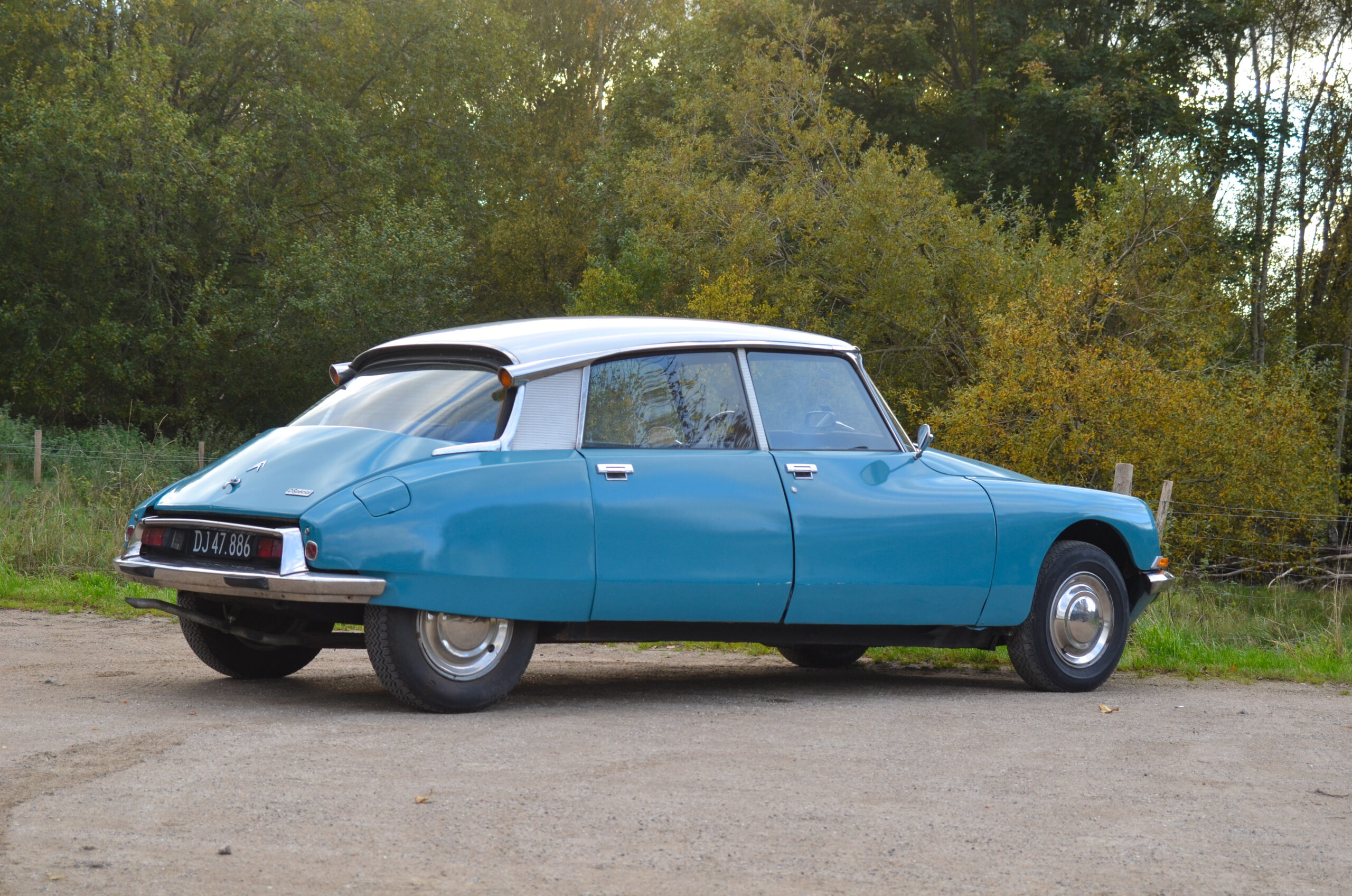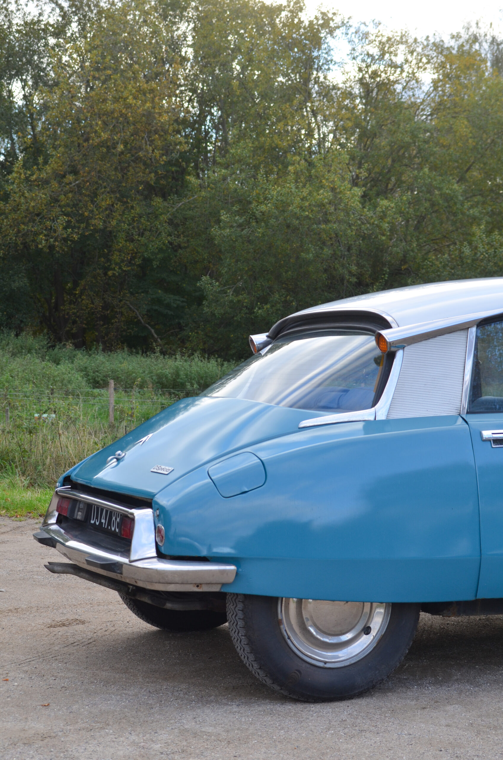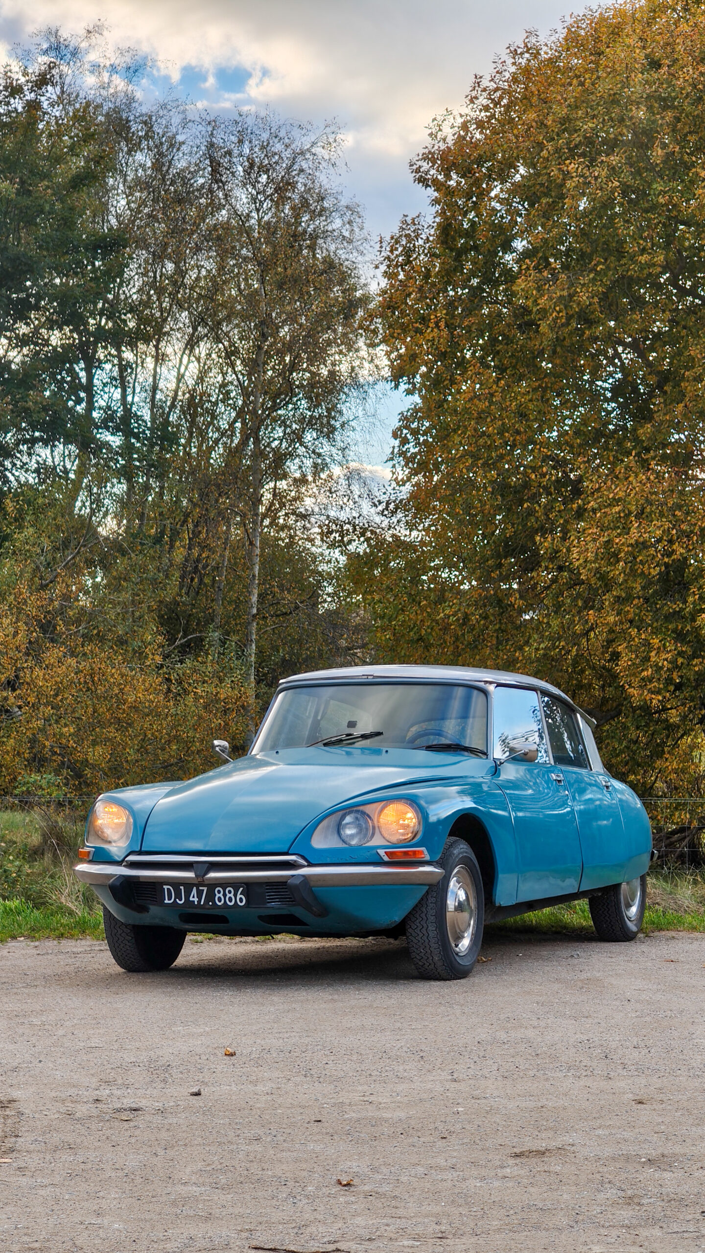 En ægte Citroën DSpecial fra 1974 udbydes her til salg, lakeret i den smukke “Bleu Lagune” farve, som sammen med det hvide tag giver bilen et fantastisk retro look.