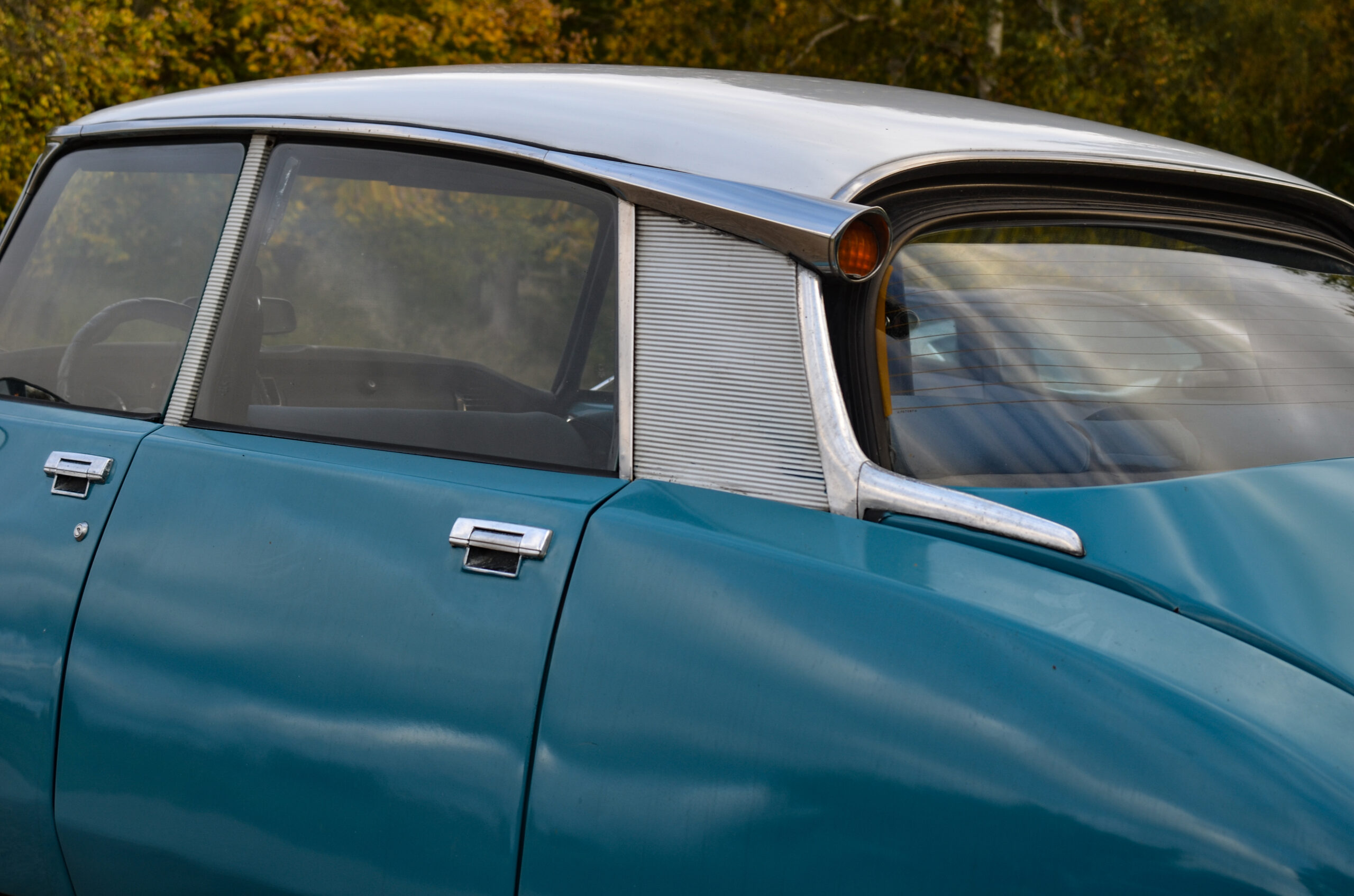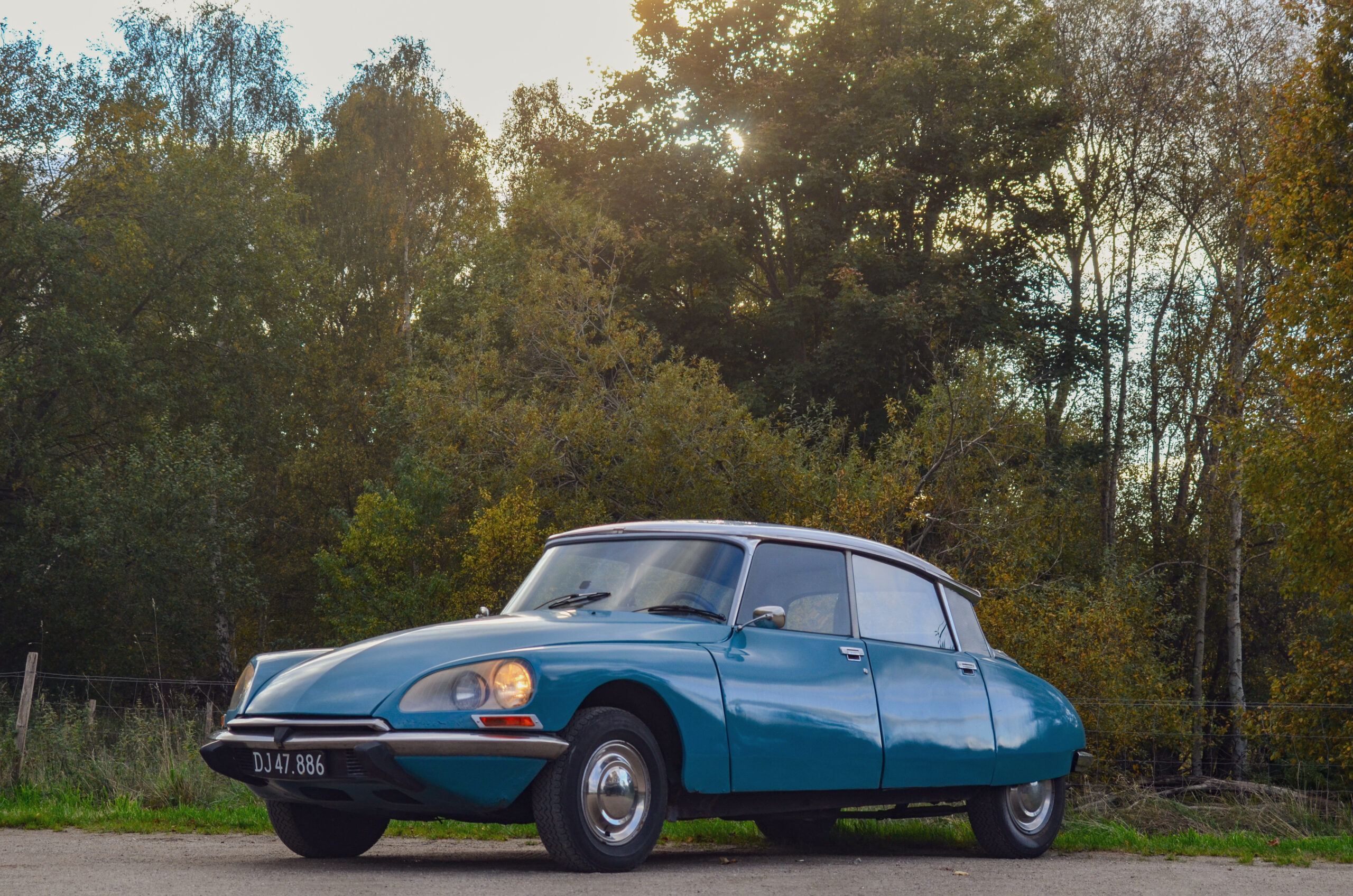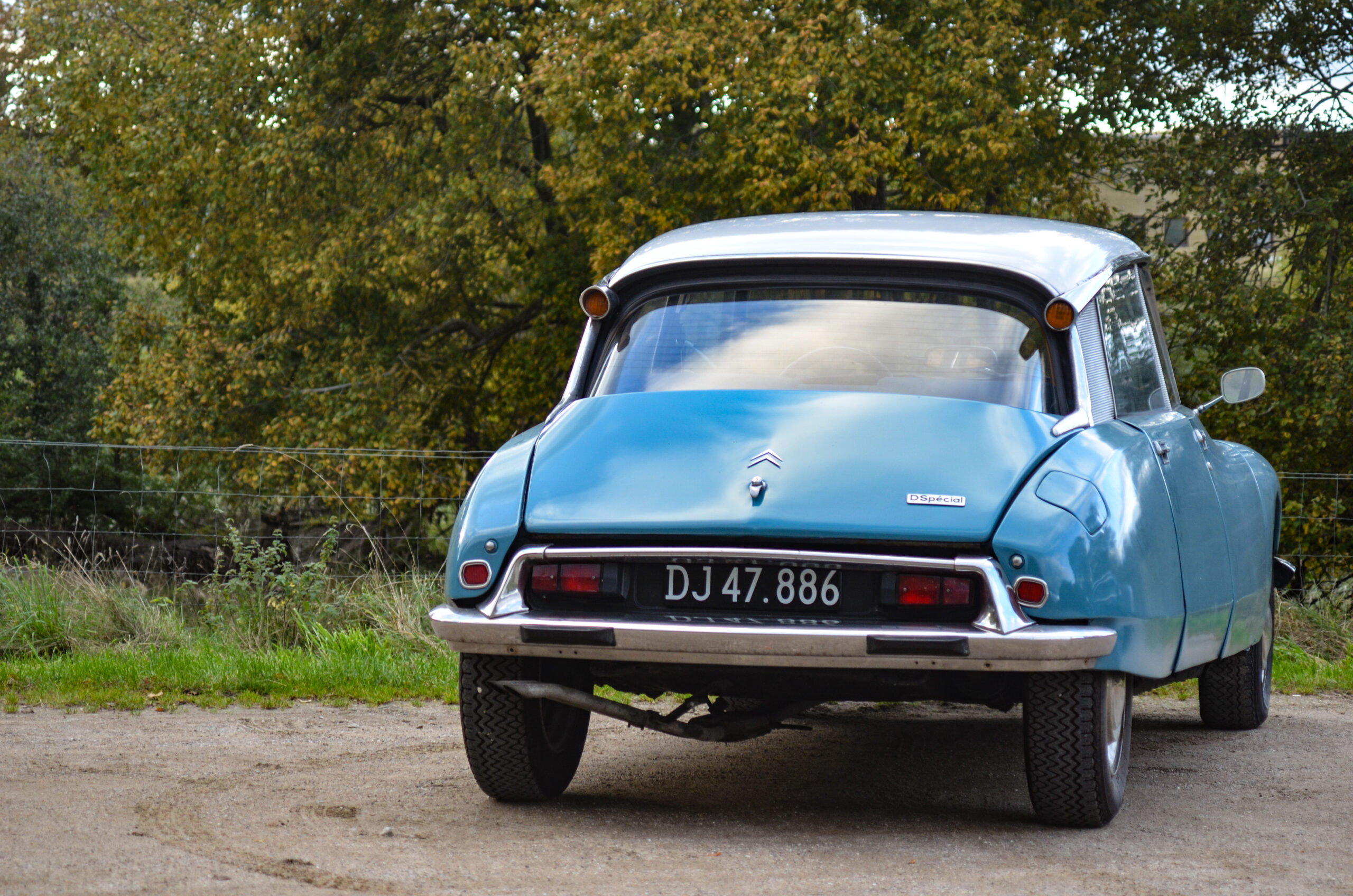 En ægte Citroën DSpecial fra 1974 udbydes her til salg, lakeret i den smukke “Bleu Lagune” farve, som sammen med det hvide tag giver bilen et fantastisk retro look.